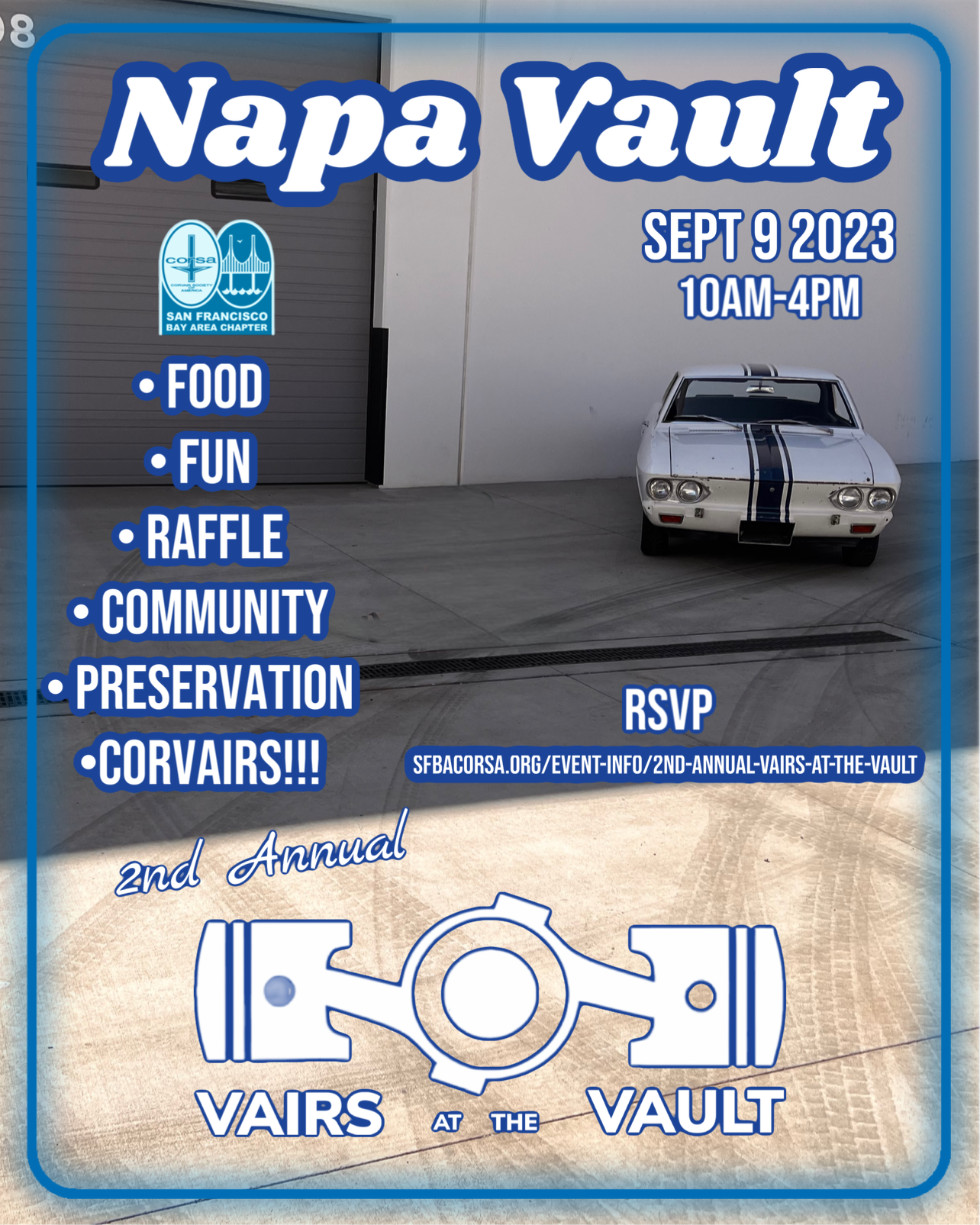 There will also be a 50/50 raffle, raffle prizes, food, wine, Corvairs and,