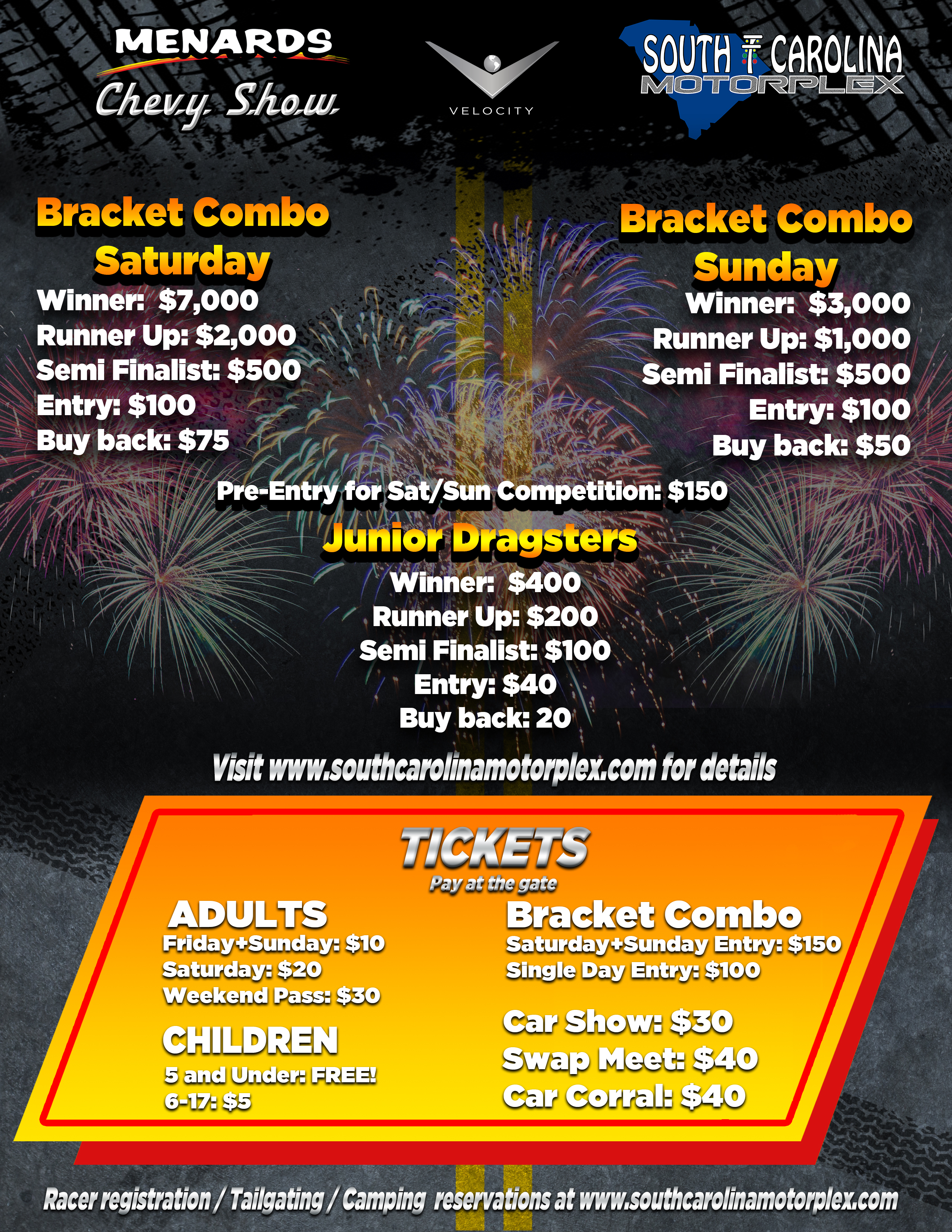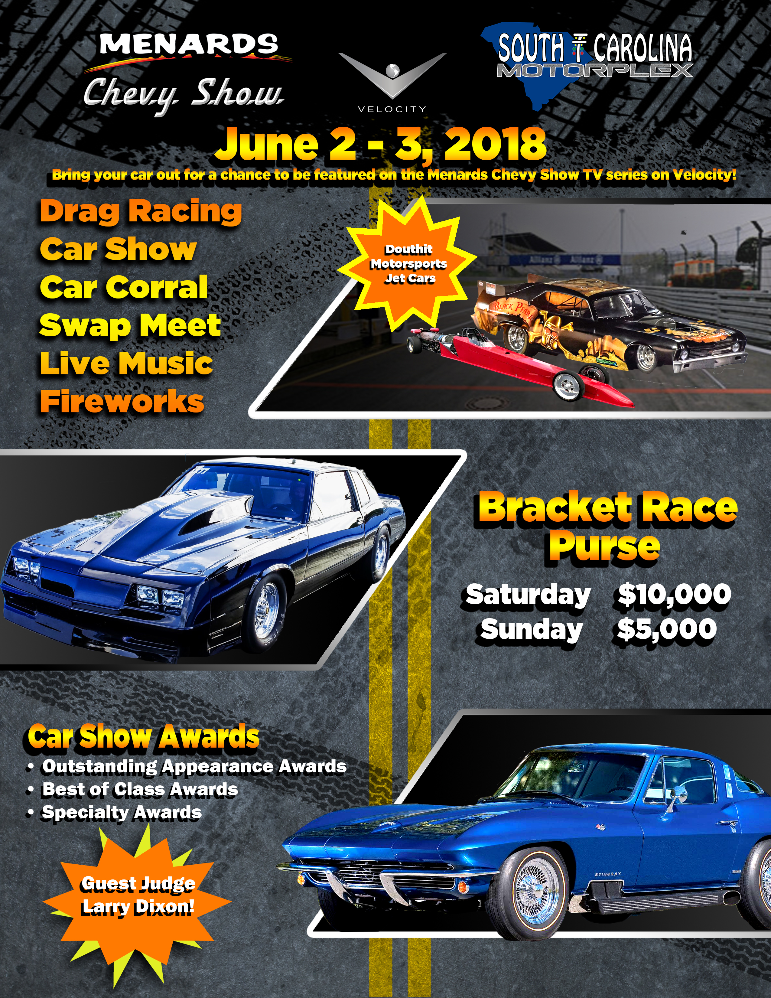Thanks for talking with me yesterday. Attached is some information about the upcoming Menards Chevy Show at South Carolina Motorplex in Orangeburg. We would love to have you and all your club members attend the event on June 2, 2018. A TV crew from Velocity will be on-site filming for an episode of the Menards Chevy Show TV series. They will be looking for great cars to feature at the event. If you are not familiar with the show, a link to past episodes is below.