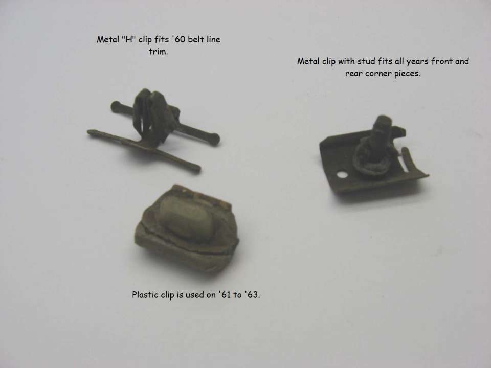 I am searching for the conversion of these clips or perhaps some guidance on how to get what I need from your company in terms of clips to attach my beltline trim. Upon my search on you website I was not able to convert the gm part numbers. I have included all the 1960 gm part numbers , a picture of the different types of clips used you can cross reference with what you have that has come out and possibly something stainless steel? I have also included the diaphragms of my car from the gm part catalog that reference the moulding clips and trim locations. I've given you all that I have and need a resolution that will allow me not to rely on collecting some 50 year old clips from people all over the us. I'll never have the original trim back on the car at this rate. This is all you need. I've included a picture of how the clips look. With that said, perhaps you can tell me what clips from your website you have that I can use for my application. I look forward to hearing back from you soon. Perhaps this can also aid in helping other Corvair enthusiast who have trim, beltline trim and etc in the future.