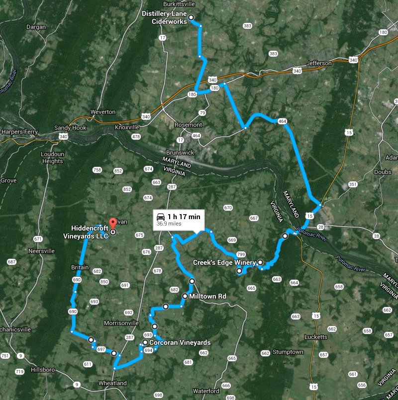 > With salt season quickly approaching, I've organized another tasting tour. This one starts at a cidery in Jefferson, MD before proceeding to three wineries just over the border in northern VA ending just west of Lovettsville. We'll caravan from tasting to tasting over curvy country roads. On Saturday, October 10 at noon we'll meet at the Distillery Lane Ciderworks (5533 Gapland Rd, Jefferson, MD). Following are our destinations including the estimated time of arrival (if you care to only join for a couple stops) and prices for tasting at each. FYI, these prices are for a flight of tastings, not per glass.
