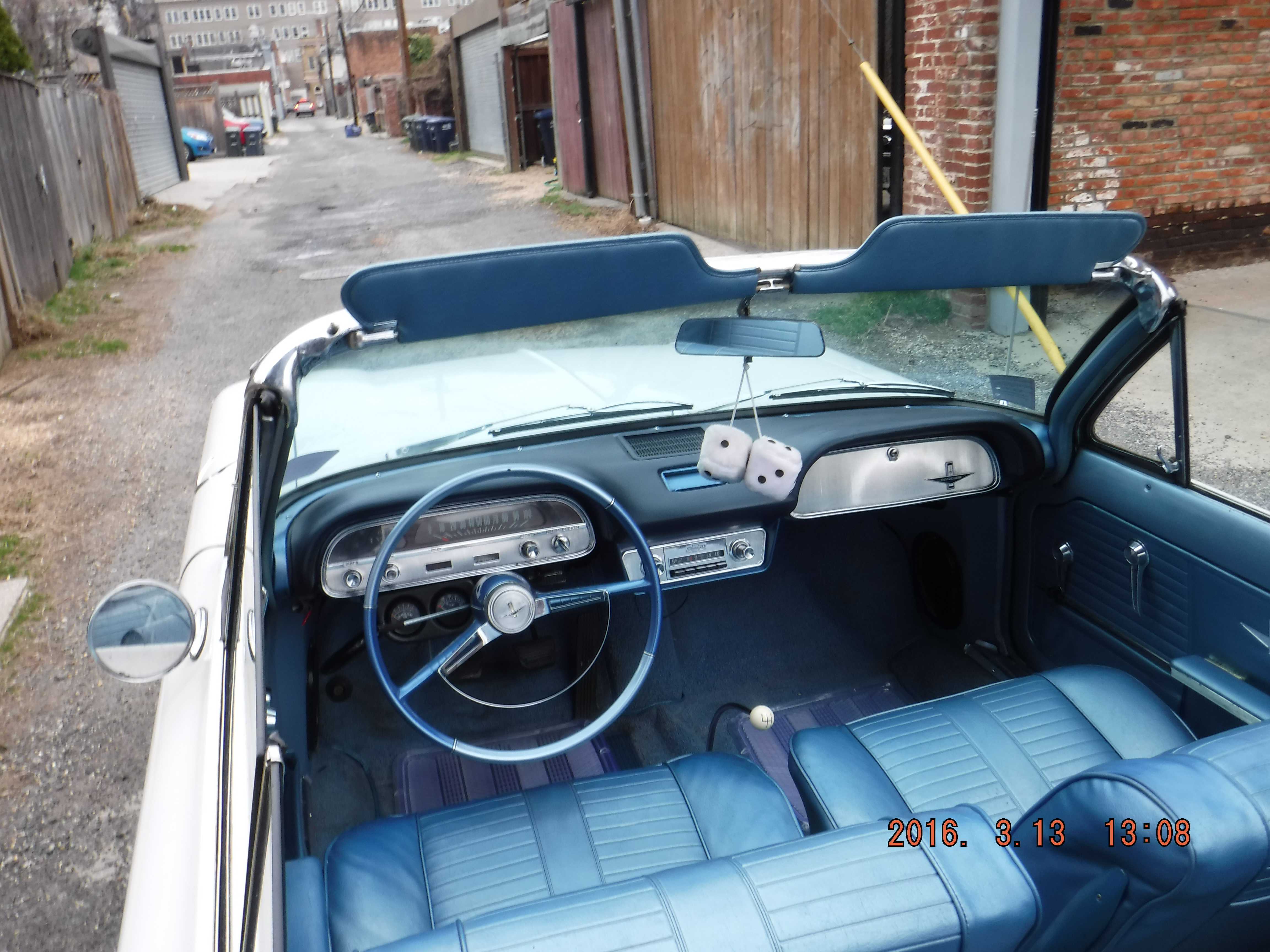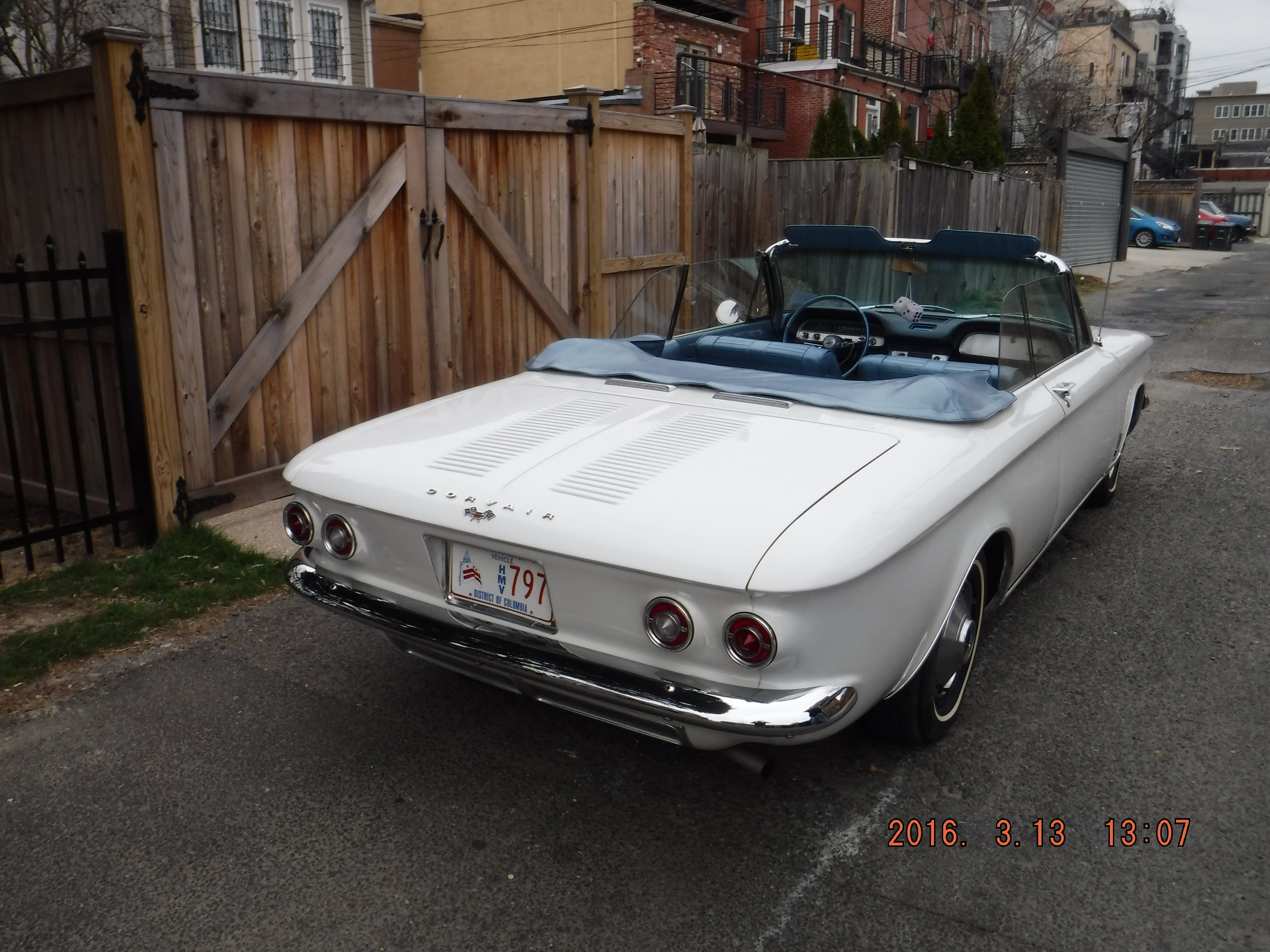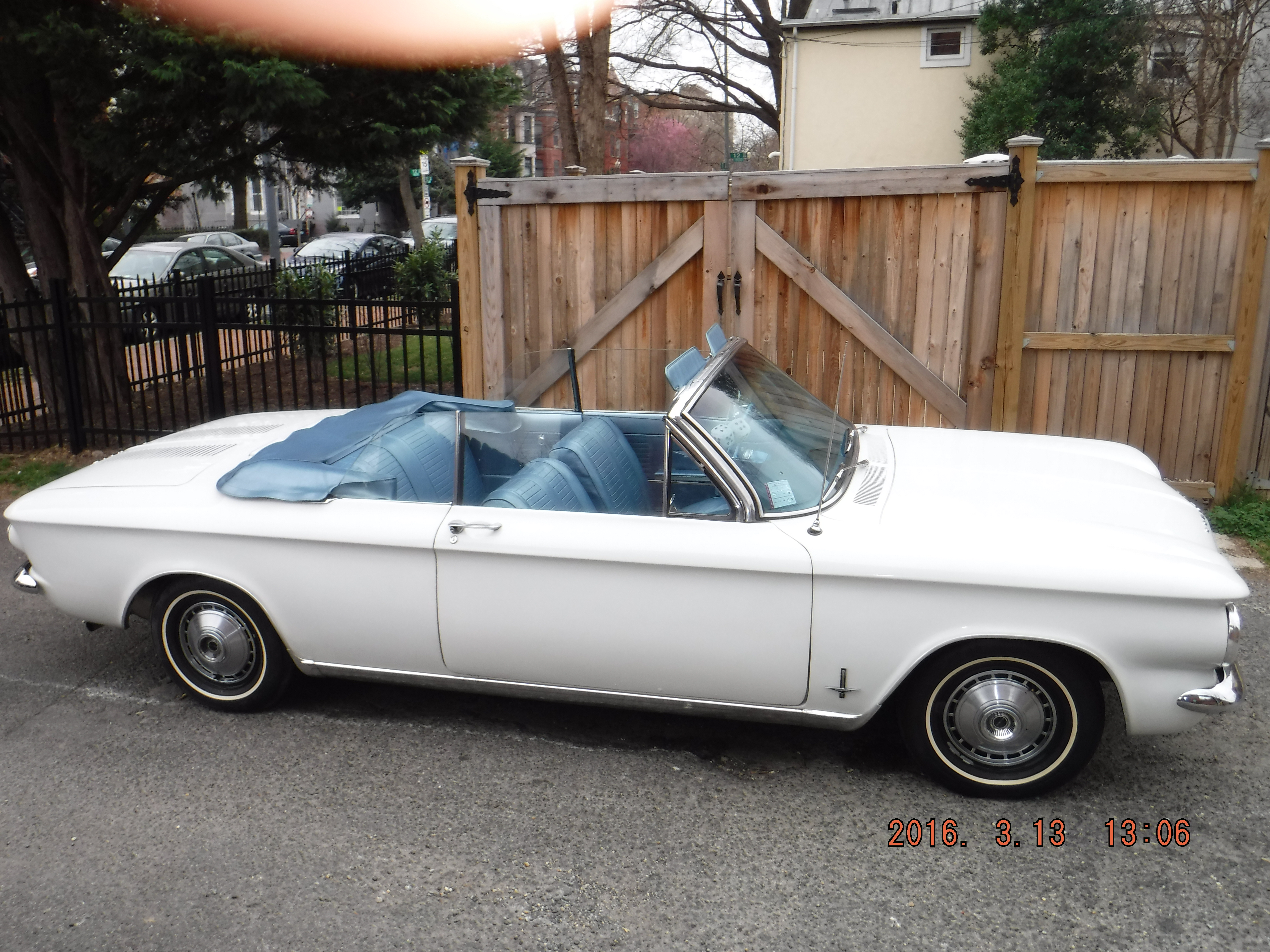 > I am selling my 1964 Corvair Monza convertible. I have owned the car since 1979, when I purchased it in Alexandria, Virginia from the second owner. The original engine was leaking badly when I got it, and had poor compression in several cylinders, so I purchased another 64 Monza with the 110 engine, which I installed with the help of Corvair loving friends. The car was fully restored in the late 1990's including paint and rust repair, complete new interior except for the original padded dash that remains including seats, door cards, boot, sunvisors, carpets, and top surround areas. All interior, window, and top gaskets were also replaced at that time, as was the top. A dual master cylinder was installed. The car has a power top (motor replaced) which works fine, although the switch is somewhat loose. The car also has a tinted windshield. The car has 94,400 miles which I believe is original, as I have only put on about 18,000 since buying it. The car was originally Silver Blue with blue interior, but I had the color changed to correct "Ermine White".