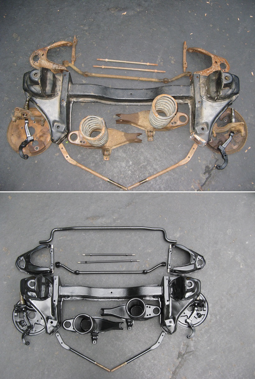 Happy to post the pics. Great day. My Corvair is all apart but I am working on it now. I just got the 21 pieces pictured back from the Powder Coater. Same shop that did Fred's suspension did mine. The sway bar is missing from the Before picture because it was found in the trunk and added last minute. I had printed out the picture and just drew in the bar before giving a copy to the Powder Coater. Notice anything in the pic that does Not belong in the Front?