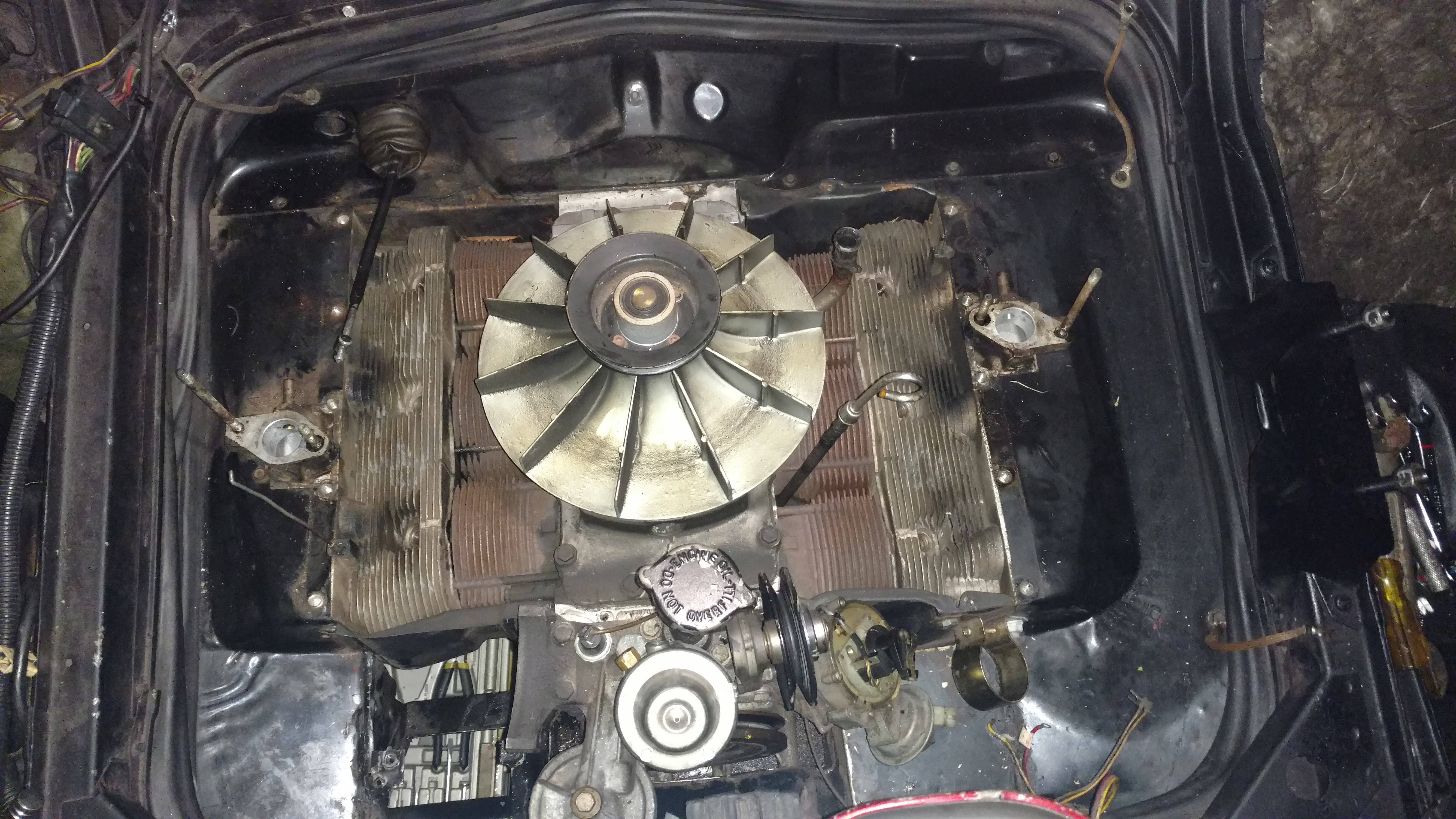 > Made some progress today on the topside. I hope that once I get the shrouds and compartment seal off, which I want to replace, I will be able to access the last bolt holding on the heater shroud on the back left corner of the compartment next to the head. Cannot get a socket or wrench on it. I am certainly learning a lot for sure. Vernon was giving me some tips on the upper head bolts, but for now the thing that bugs me is wasting a fresh oil change. He refused to tell me how he got the bolt out. Obviously, a rite of passage into corvair manhood! I think once I get the seal off, I'll have access. For now, no spoilers please as Vernon has challenged my Corvairhood.... "Vern, Vern, Vern, Vern, Vern, Vern, Vern," typed in my best Jim Varney accent.
