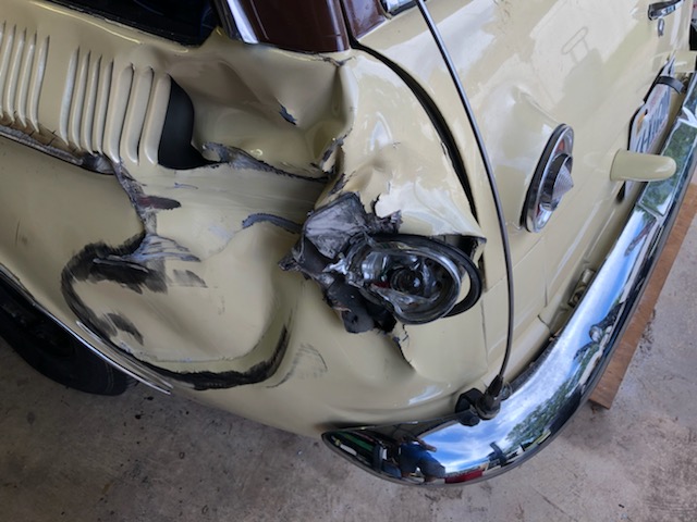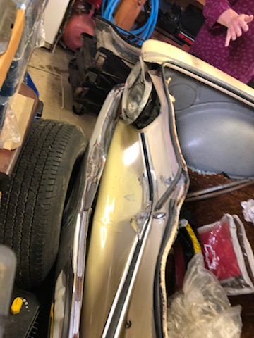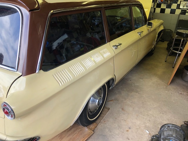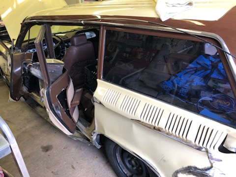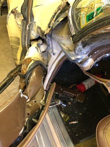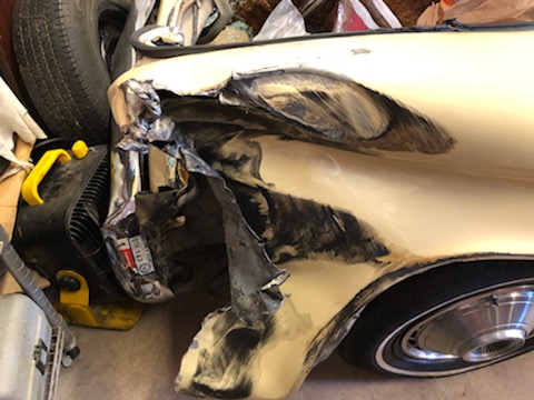 > The left side of his “64” Corvair Station Wagon is destroyed, left front fender, front panel, hood as well. Allen Bristow and Paul Whelan picked it up from the towing yard and drove it onto the trailer. It is now in a friend’s garage.