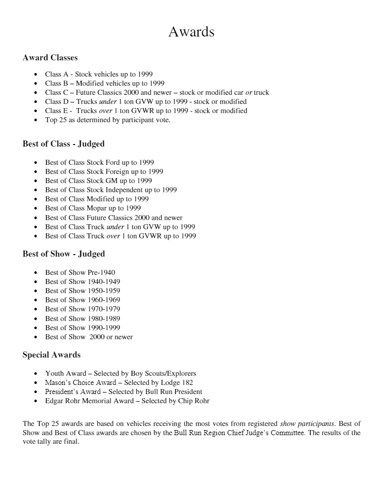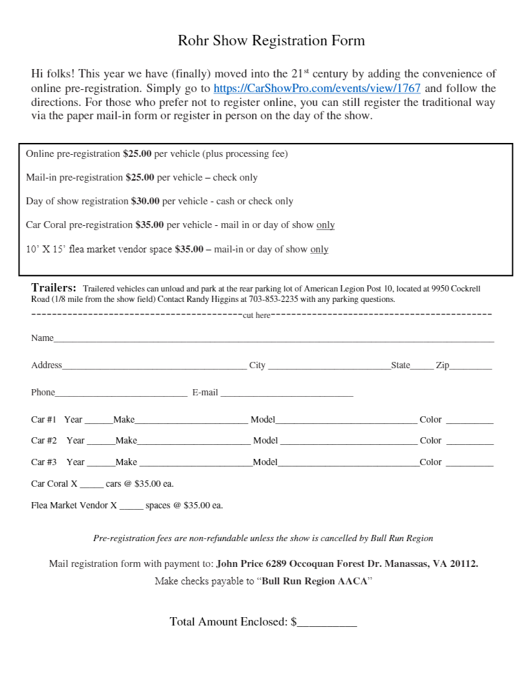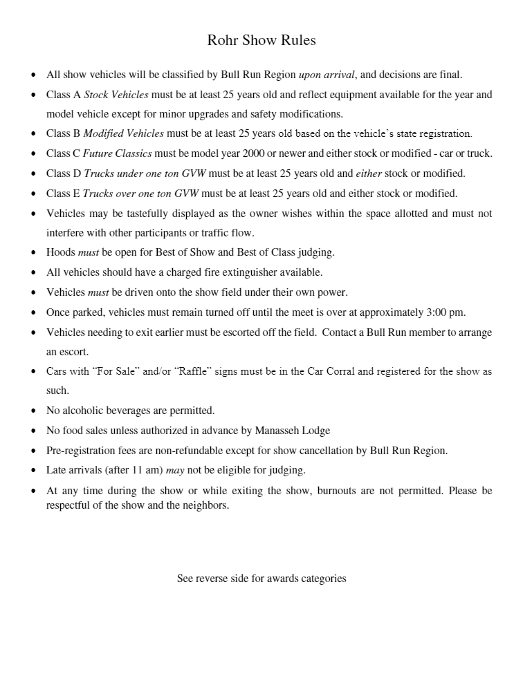 An on-line flyer, list of rules, registration form and list of awards are available at https://bullrun.aaca.com/rohr-show/ .