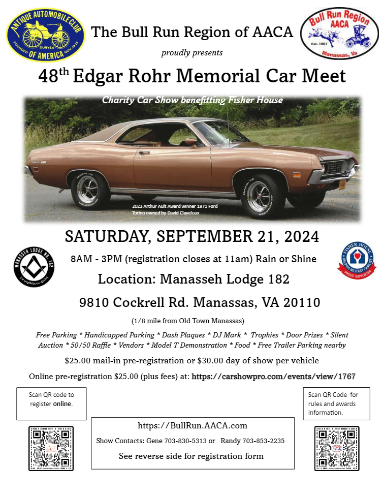 The Bull Run Region of the Antique Automobile Club of America is proud to present our 48th Edgar Rohr Memorial Car Meet – a family friendly, charity car show benefitting our Military Veterans and their families. The show will take place on Saturday, September 21, 2024 from 8 AM to 3 PM at the Manasseh Masonic Lodge 182, at 9810 Cockrell Road, Manassas, VA 20110 -- less than one mile from the center of town. Registration ends at 11 AM. Free onsite parking, including handicapped, is available.