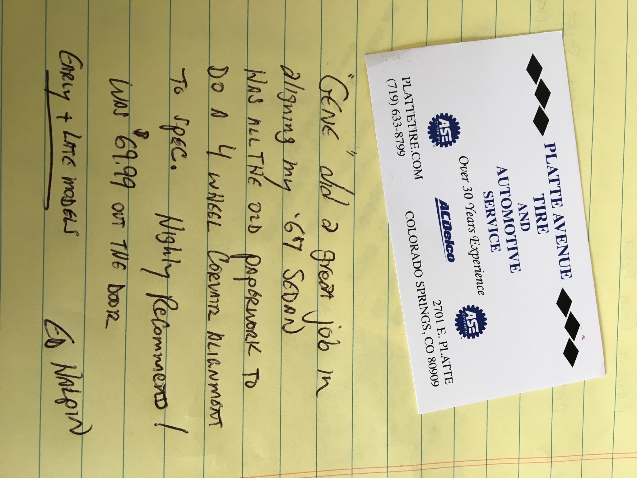 Attached is a picture of the business card I picked up from where I had the 4-point alignment done on the '67 sedan last week.