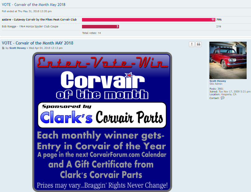 Pic attached of the final votes for May's Corvair of the Month contest, sponsored by Clarks' Corvair.