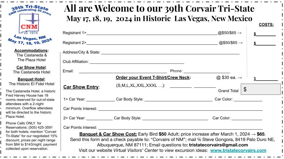 39^th Corvair Tri-State in Las Vegas New Mexico May 17,18,19.�